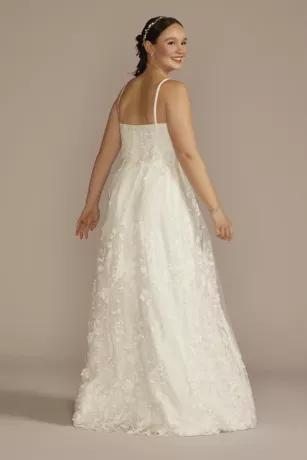Dripping with 3D floral appliques, this corset bodice wedding dress is something of a dream. The full A-line skirt is perfect for moving, grooving, and schmoozing with your wedding guests.