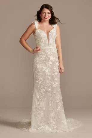 Whether it’s worn with just one shoulder, both straps or strapless, this sequin-strewn sheath wedding dress is perfect for the bride looking for versatility. Over 4,000 beads and six different shapes of floral appliques cover the dress, from the plunging neckline to the chapel train. A powermesh bodysuit sits beneath the romantic, semi-sheer lace layers for a sexy look that provides comfortable smoothing all day and night.