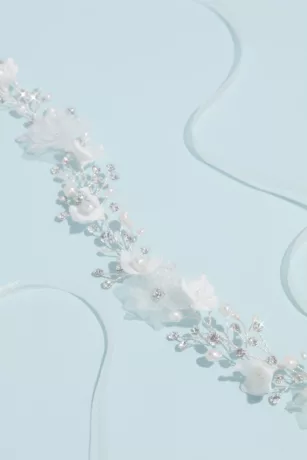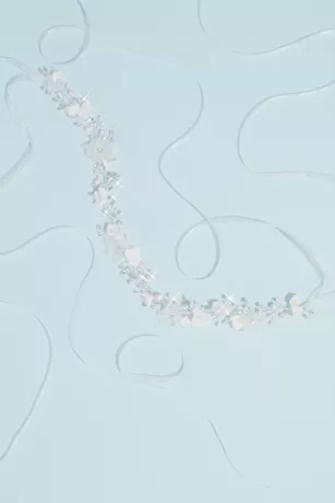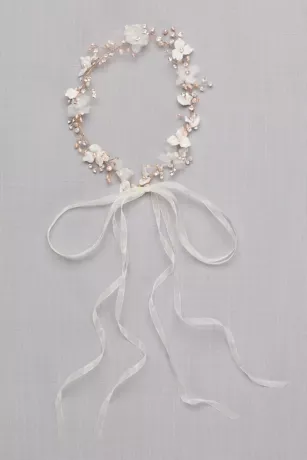 A 3D flower crown for the bohemian bride, finished with clusters of petite pearls. Wear as a headband or remove the ribbons to wear as a hair vine..