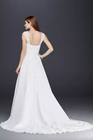 Designed with elegance in mind, this satin A-line wedding dress offers a versatile church-to-reception look, with its beaded cap sleeves. The satin skirt is topped with a metallic-embroidered chiffon overlay.