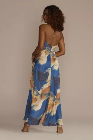 Satin-like charmeuse adds stunning shine to this vibrant floral patterned dress. A bouncy asymmetrical ruffle decsends from the wrap-style waistline, revealing a high-low hem that’ll show off your best heels.
