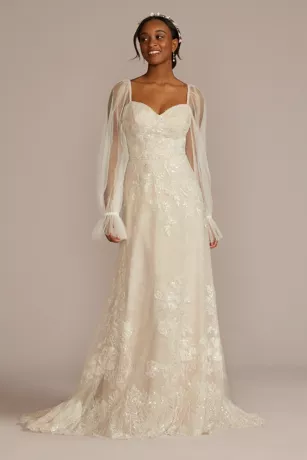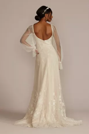 Lace appliques are artfully placed by hand over 11 hours to ensure a dreamy bohemian aesthetic on this A-line gown. Breathable, soft net long sleeves add a level of whimsy alongside a low back detail.