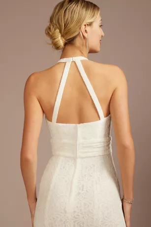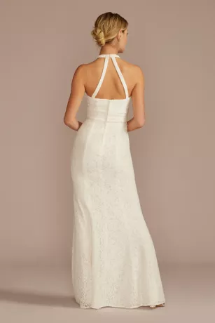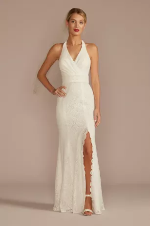 On your wedding day, simple can be spellbinding. A sheath silhouette and halter neckline are brought to life with allover lace fabric and a flirty skirt slit. Artistic ruching at the bodice, complete with a banded waist and strappy back, adds allure and ample space for accessories.