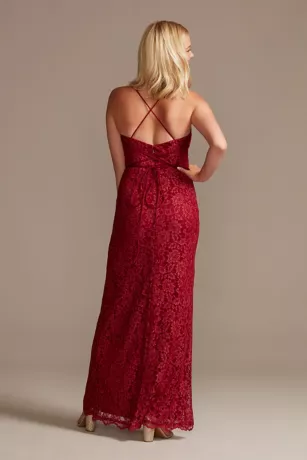 This lace sheath gown is designed to be eyed from head to toe. A plunging neckline features scalloped eyelash trim, while a sexy slit accents the floor-length skirt. Style the tie waist in so many ways for extra wearability.