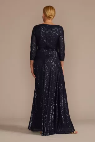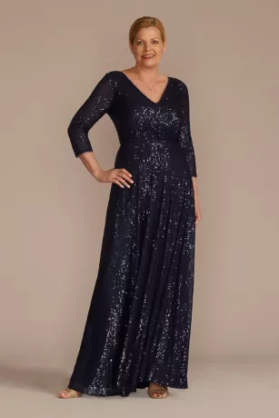 Radiate glamour in this sequined A-line dress featuring a V-neckline, three-quarter sleeves, and ruched bodice detailing that makes all the difference.