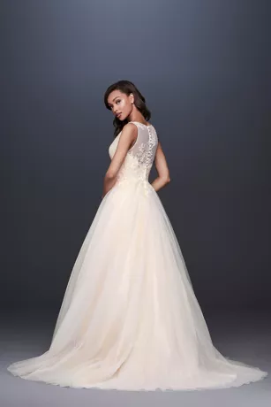 Beaded floral lace appliques encircle the waist of this V-neck wedding dress. The gleaming glitter tulle A-line skirt adds beautiful sparkle to your wedding look.