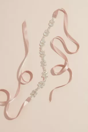 Luminous crystal leaves outlined with metallic beads adorn this slim, satin-tied sash.