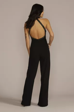 A refined silhouette made from figure-flattering crepe with delicate beaded detailing, this halter jumpsuit is a classic staple piece.