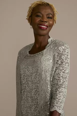 A versatile look with standout shine, this short lace sheath dress features beading at the neckline. The matching lace jacket provides coverage (and options!).