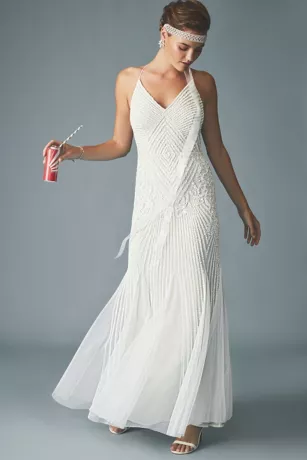 Adorned from V-neckline to hem in intricate beadwork, this stunning sheath dress features crisscross straps and godets.Â