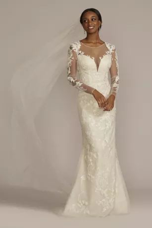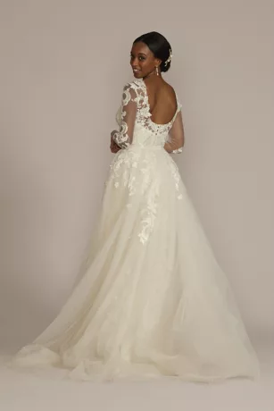This beaded sheath wedding dress is brought to life with a removable overskirt. Illusion sleeves decorated with hand-placed lace appliques will enhance your bridal elegance alongside an open back detail.