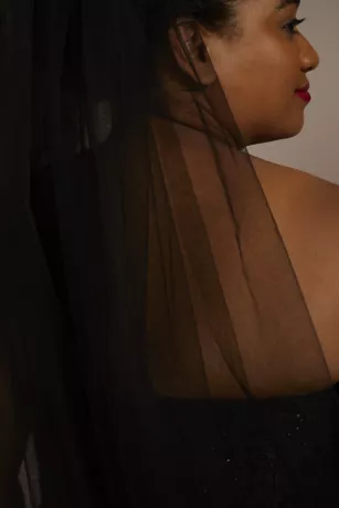 Give bridal style an edgy twist with this diaphonous chapel-length tulle veil dyed in black.