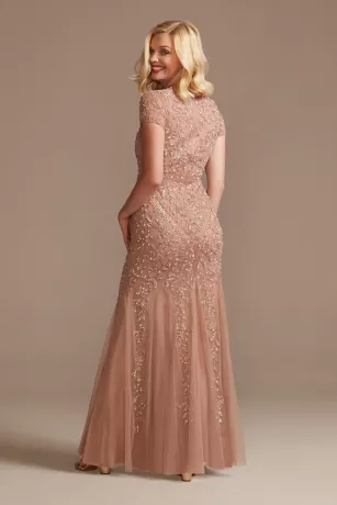 Covered in stunning beadwork from the cap sleeves to the godet skirt, this sheath gown is designed to capture the attention of every guest.