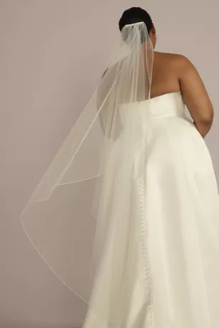 Modern minimalism lends a fresh touch to a bridal signature with this sheer tulle veil, cut in a mid-length with a pencil edge that creates a cascading effect as you float down the aisle.