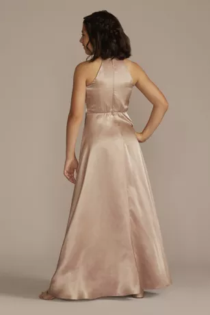 A keyhole at the neckline adds a cute touch to this silky, satiny charmeuse junior bridesmaid dress.