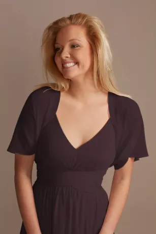 Lightweight and breezy, this soft chiffon bolero capelet with flutter sleeves is perfect for adding some coverage at a summer wedding.Â
