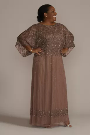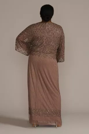 This timeless sheath dress features crosshatch and linear bead pattern, cold-shoulder flutter sleeves, and a blouson bodice.