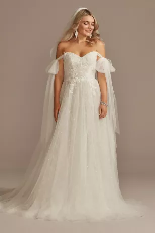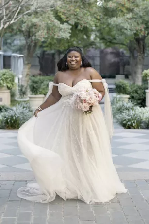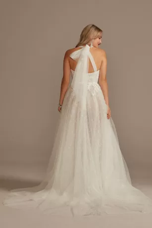 This hand-draped tulle wedding dress offers multiple gown looks in one, the long tulle straps at the bodice can be tied off-the-shoulder or into a halter. The floating tulle-and-lace skirt reveals a powermesh bodysuit beneath, creating a super sexy bridal style. Complete with sparkling lace appliques.