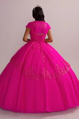 Mesmerize your guests in this vibrant quinceanera gown, featuring sparkly sequin-trimmed appliques and a six-layer tulle skirt. The matching bolero adds a pretty layer and can be easily removed for pictures or dancing!