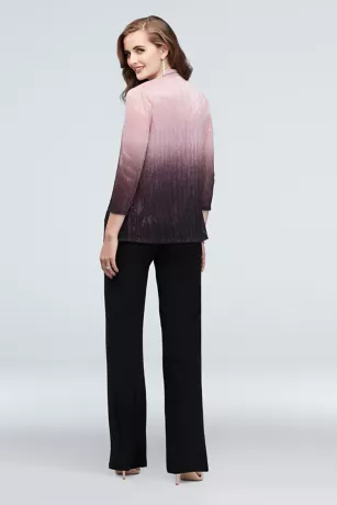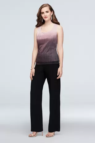 A metallic ombre jersey tank and matching jacket add stylish shine to this flowy pantsuit.