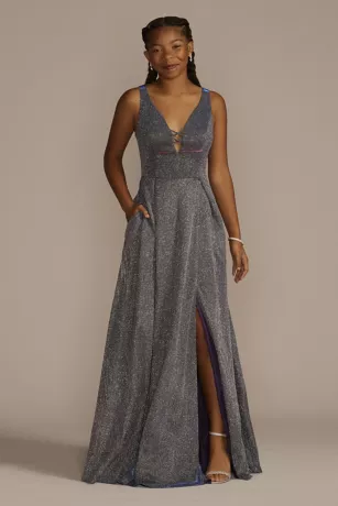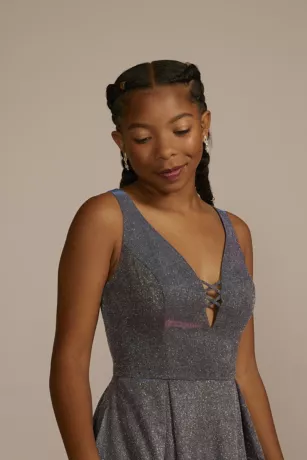 This iridescent ball gown’s metallic fabric reflects your impeccable prom style. A timeless silhouette becomes so youthful thanks to a sexy crisscross detail on the plunge neckline.