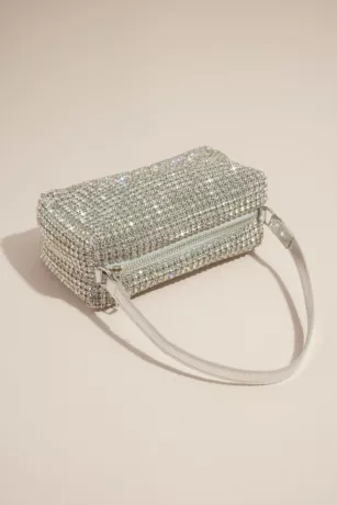 This slouchy purse features a metallic top handle and allover shiny rhinestone crystal embellishments.