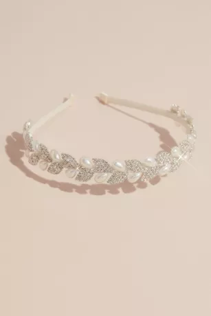 Featuring a garland of alternating crystal leaves and pearl teardrops, this headband will add sophisticated sparkle to your wedding day look.