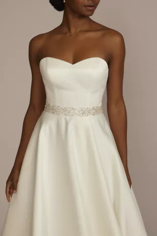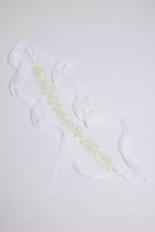 A piece of jewelry for your wedding dress, this delicate, deco-inspired sash features stylized crystal blooms. Finished with organza ribbon ties.