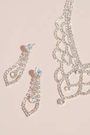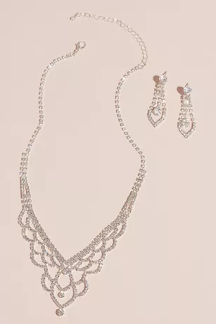 - Deep-V scalloped necklace and tear drop earrings with rainbow crystals.
