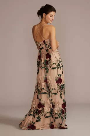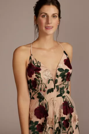 A floral-embroidered layer transforms this V-neck bridesmaid dress into a dream for the big day and beyond.