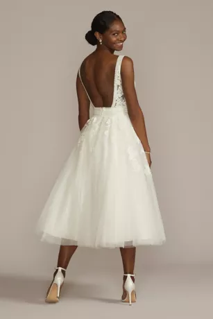 Detailed with luxe embroidered appliques and three types of lace, this elegant glitter tulle wedding dress is a dream for boho and romantic brides. Crochet trim along the V-neckline, open back, and waist adds a dainty finish to the illusion-accented bodice and beautifully contrasts the dramatic tea-length skirt.