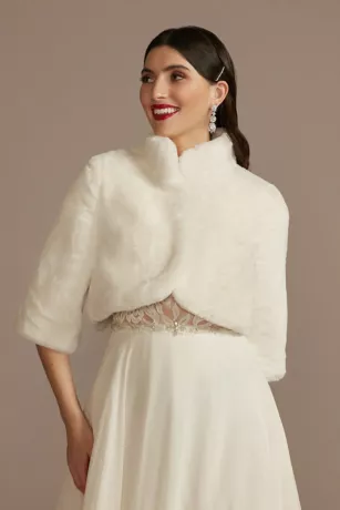 Stay toasty and look glamorous in this soft faux-fur jacket with three-quarter sleeves.