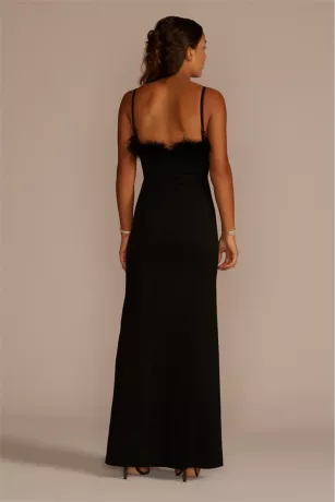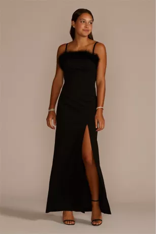 Sleek yet anything but simple, this luxe sheath dress will solidify your spot as the class trendsetter. Debut this feather-trimmed number, complete with a thigh-high slit, at prom, and you’ll have everyone talking. Detachable straps add versatility to your look.