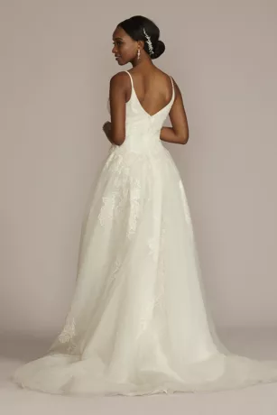 Over 1600 beads are placed by hand to create the sparkly bodice on this wedding dress. A full tulle skirt flows from the drop waist into a gorgeous chapel train, decorated with elegant floral appliques.