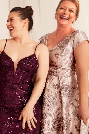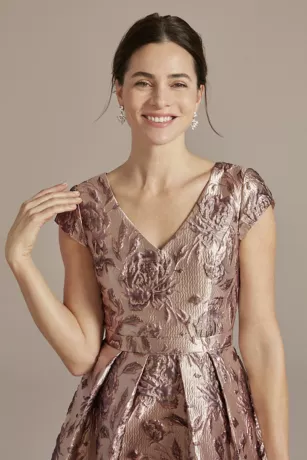 Metallic brocade flowers make this cap-sleeve A-line dress a shining option for any event.
