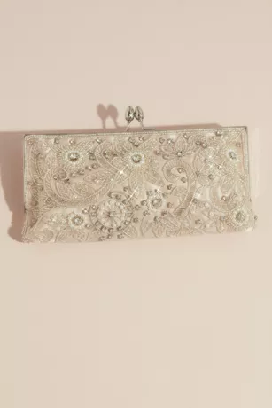 The most romantic way to carry your big-day essentials, this crystal-encrusted clutch features beaded swirls and floral motifs fit for a duchess. A smooth satin back ensures your dress won’t snag.