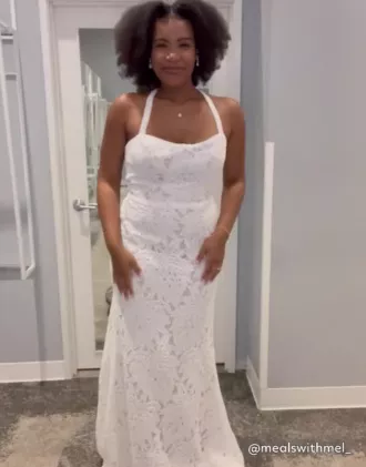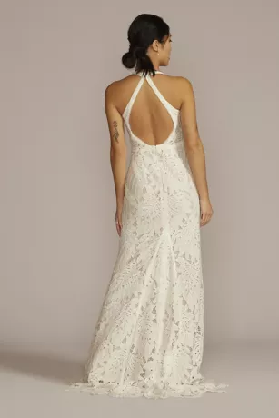This full-length sheath’s allover lace and keyhole back make for a bohemian dream. Fully lined with powermesh, designed for compression and comfort, you’ll look and feel great all evening long. The lace trim and scalloped border at the train create a magical moment as you make your way down the aisle.