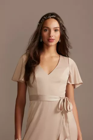Crafted of crepe-back satin, this bridesmaid dress has a luminous shine from the flutter sleeves to the V-neckline to the ruffled skirt hem. A tie at the waist adds the finishing touch.Â