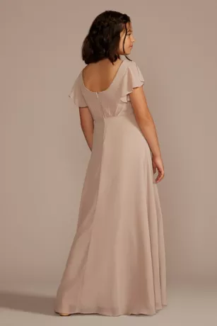 From the softly pleated, V neckline to the billowy, floating full circle skirt, this long chiffon junior bridesmaid dress gives a dreamy aura. The faux-wrap style bodice is finished with soft flutter sleeves.Â