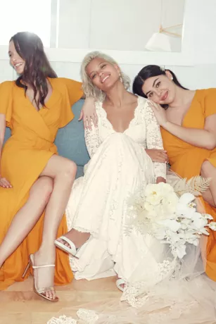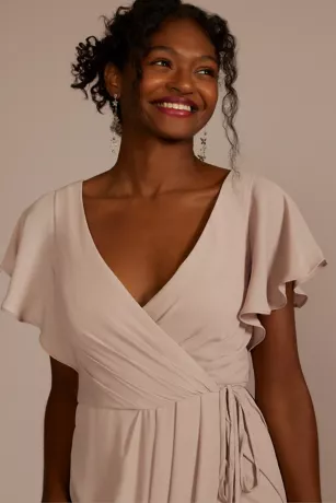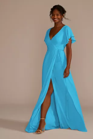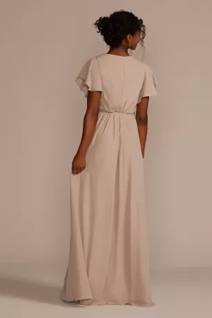 Flutter sleeves and elegant pleats wrap around the bodice of this soft georgette bridesmaid dress.Â