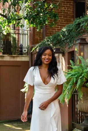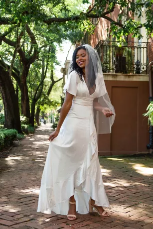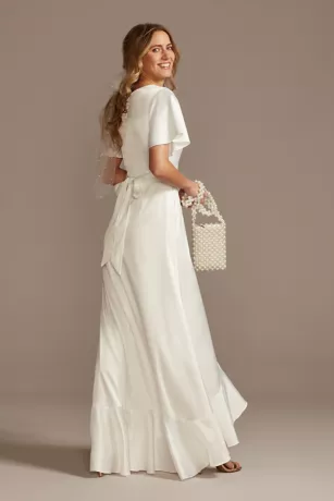 Flutter sleeves, a faux wrap bodice, and a cascading ruffle give this dress boho vibes. The stretch satin material makes it a comfortable yet chic option for a second dress or any wedding event.