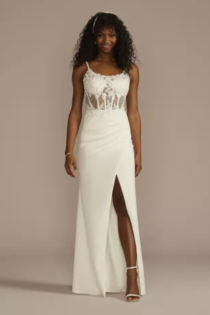 Dial up that bridal glow in a sheer bodice decorated in alluring lace. A wrap skirt caresses your curves while the slit detail highlights your legs (and the shoes)!