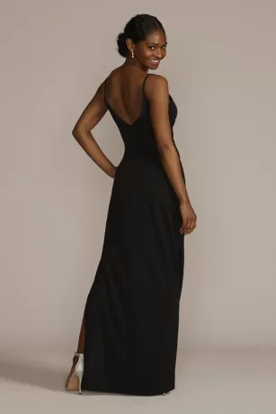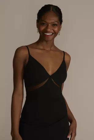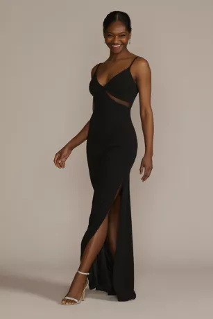 Risque details come with great rewards on this stretch crepe dress featuring tastefully revealing cutouts. Clean lines on the bodice and a skirt slit add interest to a classic sheath silhouette.
