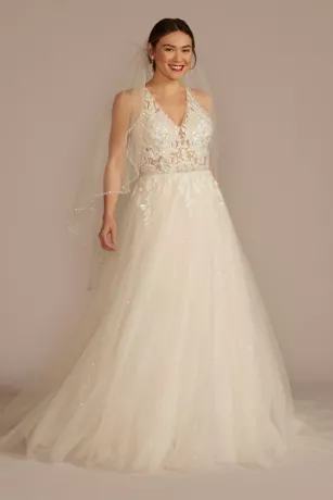 Every step down the aisle is a dream come true. Make it even dreamier in a voluminous tulle skirt with a chapel train that flows with you as you move. Showcase your sexy side with an illusion halter neckline covered in beaded lace, with a gorgeous beaded belt cinching your waist.