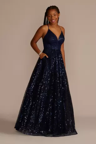 This floor-sweeping ball gown with an illusion v-neckline features glistening sequins designed to stand out at prom or your next special event. Pockets come in handy for stashing every last essential. Finish the look with illuminating accessories for an unforgettable ensemble.
