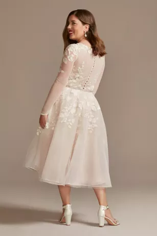This captivating long sleeve wedding dress catches the light in so many gorgeous ways, from the crystal-beaded waistband to the jeweled buttons down the illusion back, to the sparkling sequin lace appliques on the tea-length skirt. Adding to the drama are a plunging illusion bodice with visible corsetry and a pink-tinted underskirt that gives your wedding look a coy hint of color.