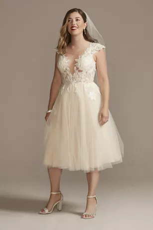 Intricate floral lace appliques, embellished with nearly 4,000 beads and sequins, adorns the illusion plunge bodice and trims keyhole back of this romantic wedding dress. The soft tea-length skirt is finished with a fashion-forward double slit that lends movement to every step.