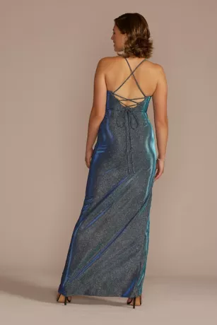 Prepare to wow the crowd in this floor length iridescent gown designed to show off your style and shape. A bold ruffle slit makes a stellar first impression, and a memorable lace-up back ensures a lasting one.
