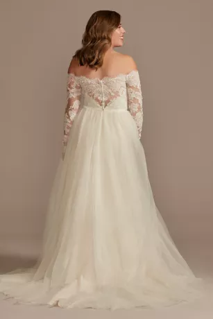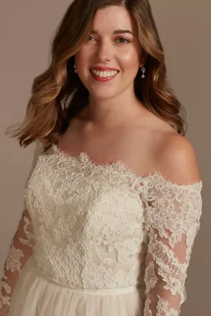 An off-the-shoulder bodice, with scalloped trim and appliques, is the focal point of this elegant long-sleeve A-line wedding dress. Tonal lining beneath the layered tulle skirt adds a warm touch to the romantic wedding-day look.