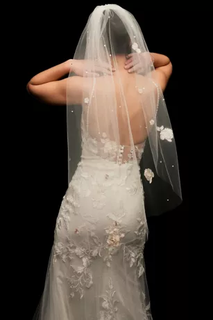 A subtle mermaid gown is always a showstopper. Add a plunge neckline, beaded floral lace appliques, and an illusion button-back, and you’re guaranteed to command your guests’ attention all night long.